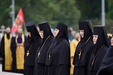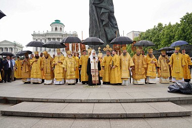 Далее состоялся крестный ход через Боровицкие ворота Кремля к памятнику равноапостольному великому князю Владимиру, где Святейший Патриарх Московский и всея Руси Кирилл возглавил молебное пение.