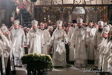 Его Блаженству сослужили: наместник обители митрополит Вышгородский и Чернобыльский Павел; управляющий делами Украинской Православной Церкви митрополит Бориспольский и Броварской Антоний; архиепископ Макаровский Иларий; епископ Ирпенский Климент; духовенство монастыря и гости в священном сане.