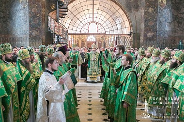 За Литургией Его Блаженству сослужили: наместник обители митрополит Вышгородский и Чернобыльский Павел; управляющий делами Украинской Православной Церкви митрополит Бориспольский и Броварской Антоний; митрополит Черниговский и Новгород-Северский Амвросий; архиепископы Житомирский и Новоград-Волынский Никодим, Нежинский и Прилукский Ириней, Роменский и Бурынский Иосиф, Северодонецкий и Старобельский Никодим, Бучанский Пантелеимон, Макаровский Иларий; епископы Боярский Феодосий, Фастовский Дамиан, Бородянский Варсонофий, Васильковский Николай, Золотоношский Иоанн, а также духовенство монастыря.