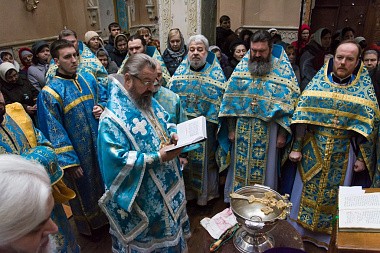 Началось праздничное богослужение молебном с водосвятием. Затем архиерей прочел особые молитвы «на отверзение храма», были окроплены освященной водой алтарь, стены и уцелевшее основание иконостаса. Множество паломников и прихожан смогли добраться в обитель Пресвятой Богородицы в этом отдаленном уголке города благодаря помощи неравнодушных людей. Игумения обители Михаила (Шевченко) и волонтеры из разных приходов Донецка приложили немало усилий для того, чтобы отпраздновать в монастыре престольный праздник. Они начали устранять последствия боевых действий: вывезли много мусора, подготовили территорию обители и сам храм.