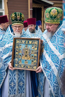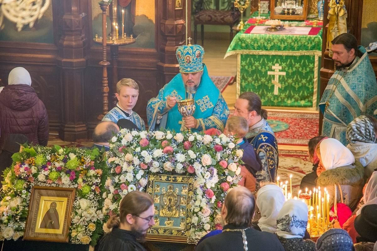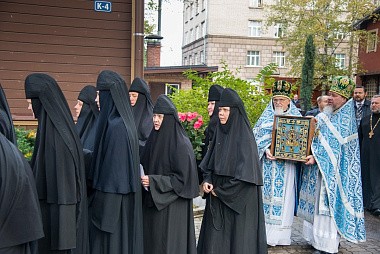 От монастырских ворот Курско-Коренная икона крестным ходом была обнесена по территории обители, после чего занесена в монастырский храм прп. Сергия Радонежского, где была совершена Божественная литургия архиерейским чином.