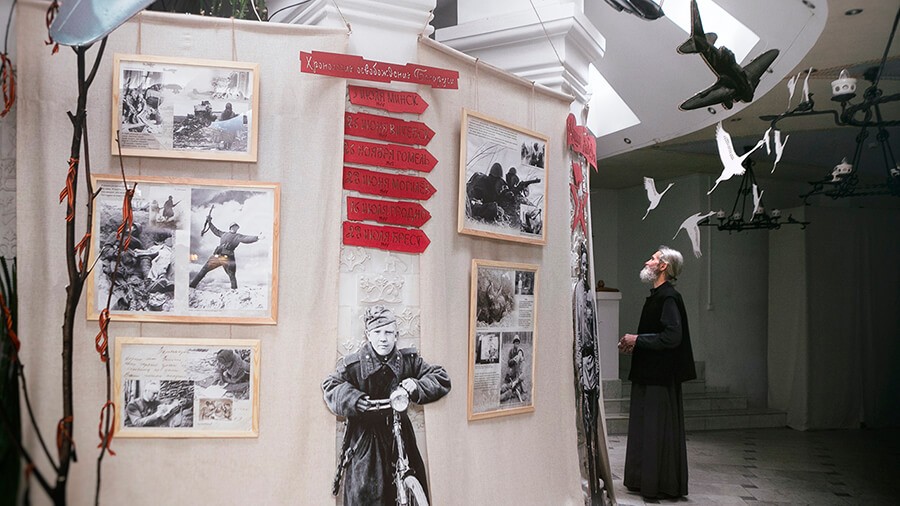 Информационные стенды рассказывают об основных этапах и событиях ВОВ, знакомят со священнослужителями и монахами, которые пережили страшное испытание войной и продолжили свой подвиг на духовном фронте в мирное время. Гости выставки узнали и о патриотическом служении Русской Православной Церкви во время войны.