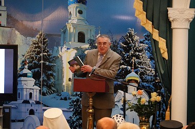 Затем с докладом выступил член Экспертного комитета стратегического планирования г. Славянска Анатолий Левит. Выступление было посвящено реконструкции археологических памятников Святогорья.