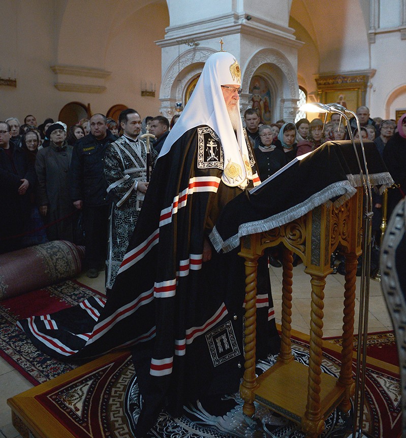 В соборе Рождества Пресвятой Богородицы Предстоятель Русской Церкви принял участие в вечернем богослужении в канун Великого вторника. На великом повечерии Святейший Патриарх Кирилл читал канон Триоди, а на утрене — Евангелие.