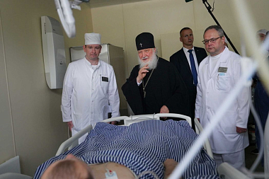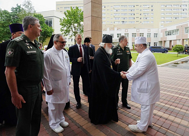 Передав в дар храму икону Архангела Михаила, Святейший Владыка направился в Многопрофильный хирургический центр, где Его Святейшество встречал заместитель начальника госпиталя по медицинской части доктор медицинских наук А.И. Павлов.