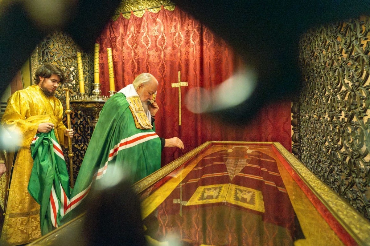 Наверное, ни в каком другом месте мы не чувствуем всего того, что связано с личностью Святейшего Патриарха Ермогена, как здесь, в этом святом храме, у его гробницы. И потому Успенский собор Московского Кремля, главный храм Святой Руси, и есть то место, где мы должны особенно молиться и просить святителя Ермогена об Отечестве нашем, о всей Руси, о преодолении расколов и разделений на Русской земле, о воссоединении народа нашего и укреплении единой Русской Православной Церкви, Матери всего многонационального народа нашего и даже тех, кто, может быть, не в полной мере причисляет себя к Православию, но через духовно-культурную традицию, созданную, вскормленную, охраняемую Церковью, получает то, что из любого другого источника получить невозможно. И то, что Церковь, пройдя через особые испытания страшного Смутного времени, сохранила во всей полноте свою роль для судеб народа, во многом заслуга старца-Патриарха, который не убоялся ни холода, ни голода, ни самой смерти, но, как и подобает Предстоятелю Церкви, остался вместе со своим народом, вместе со своей Церковью и, конечно, с Господом, Который и укреплял его на этом исповедническом и мученическом пути.