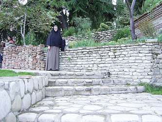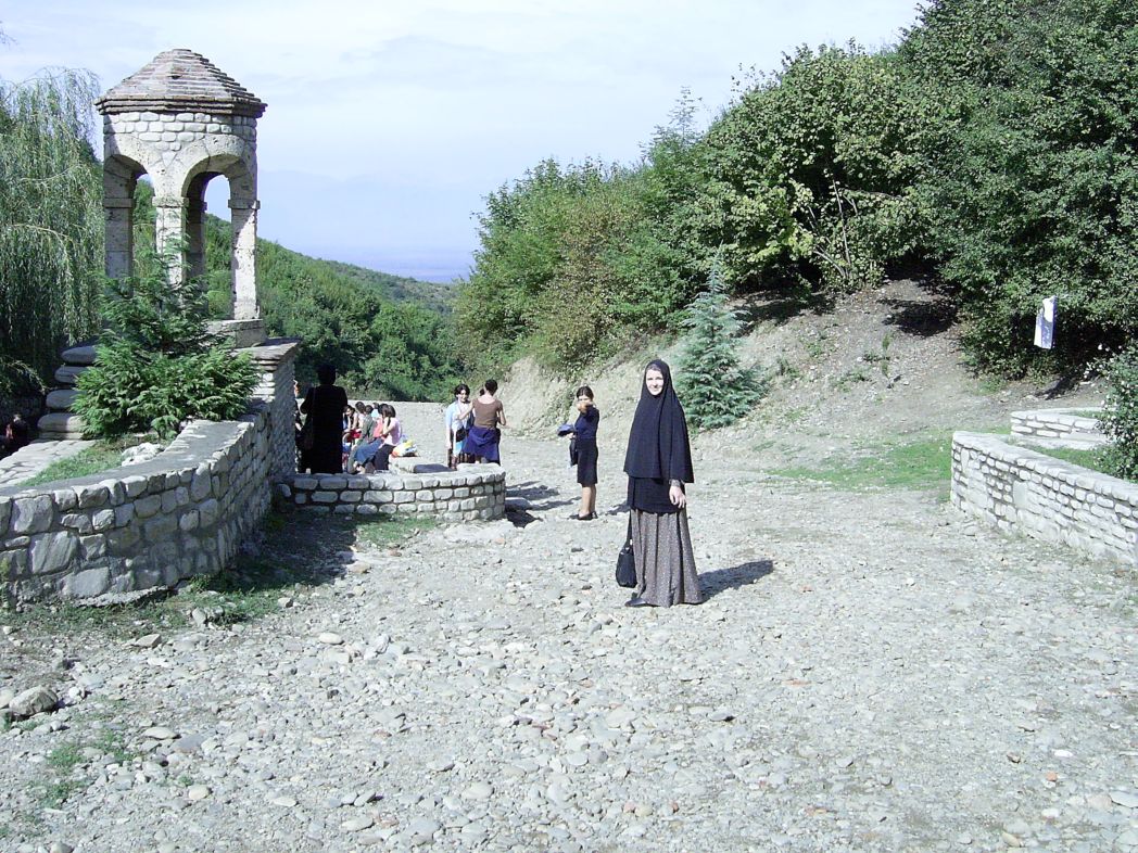 Крест, на стыке перекладин перевязанный прядью волос юной проповедницы... Как поется в тропаре святой: «чудотворный крест, егоже ты обвила еси драгими власы твоими...» Разумеется, такое желание у меня появилось, и оно вскоре исполнилось! Весной был мой постриг, а осенью я отправилась в то удивительное паломничество. Причем не просто так взяла и поехала, а заранее тщательно спланировала поездку, в которой сопровождал меня мой брат, насельник Свято-Данилова монастыря в Москве иеромонах Филипп. Мощи святой равноапостольной Нины находятся под спудом в церкви святого Георгия Победоносца Бодбийского женского монастыря. (Сам монастырь расположен в восточной части страны – Кахетии, в двух километрах от города Сигнахи, над Алазанской долиной). Вообще в Грузинской Православной Церкви нет традиции открывать гробницы святых для обретения мощей. Преподобноисповедник Гавриил (Ургебадзе) стал первым, чьи нетленные мощи были подняты наверх (февраль 2014 года), а так мощи святых там не трогают.