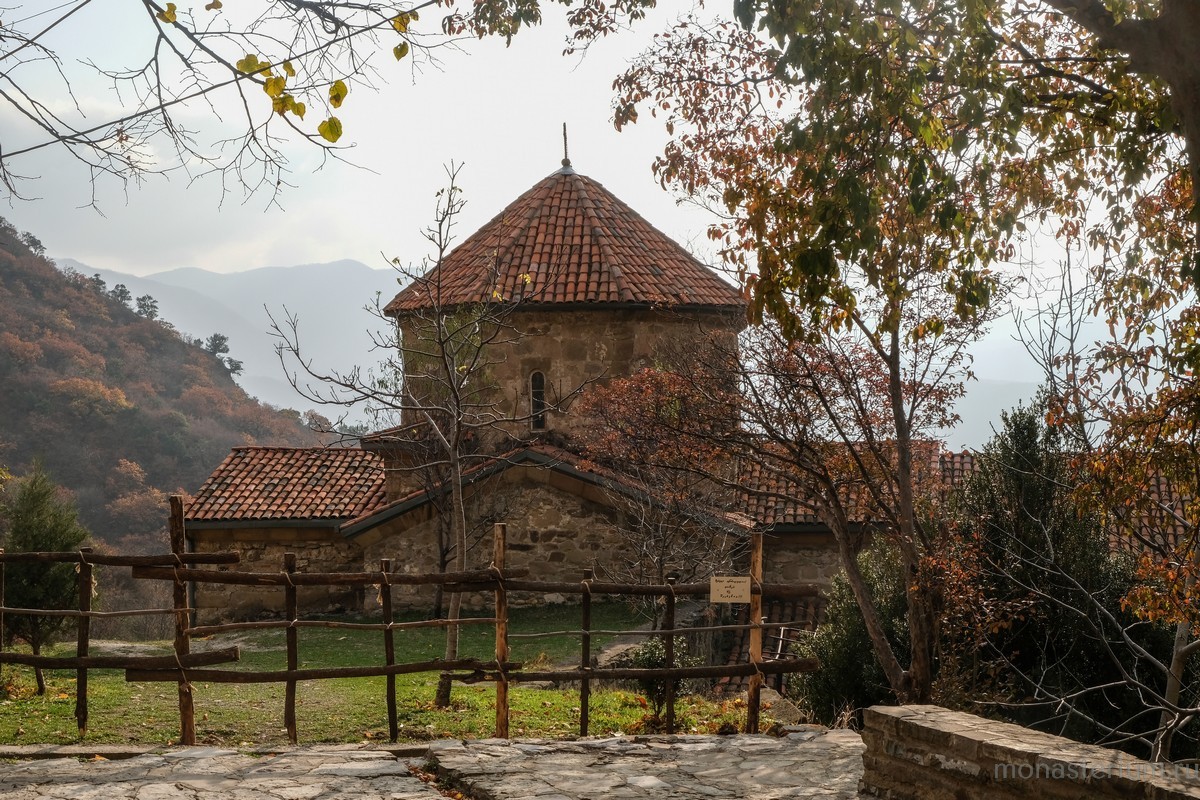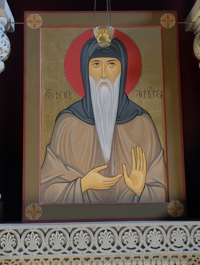Предание говорит, что при преподобном были построены три храма: Иоанна Предтечи, Пресвятой Богородицы и Пресвятой Троицы. Там, где могила преподобного, храм VI века. А храм Пресвятой Богородицы, где мы сейчас беседуем, XII века, построил грузинский царь Давид IV Строитель. Рассказывают, что храм построен на основании старой церкви, которая была во времена преподобного. Его несколько раз разрушали, особенно в нашествие персидского шаха Аббаса I. В конце XIX – начале XX века этот монастырь восстановил епископ Гурийско-Мингрельский Александр (Окропиридзе). Сейчас он прославлен в лике святых, погребен тоже в нашем монастыре. Он очень благодетельствовал монастырю, при нем сделана роспись стен – русским мастером Андреевым.
