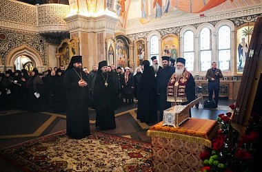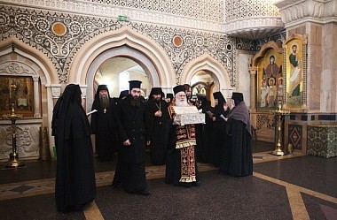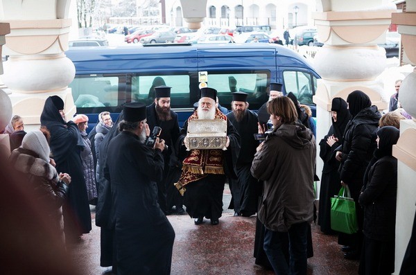 В Свято-Елизаветинском женском монастыре г. Минска 10 ноября прошла монашеская секция Регионального этапа XXV Рождественских образовательных чтений «1917–2017. Монастыри и монашество: уроки столетия», в которой приняли участие игумены, игумении, монашествующие монастырей Белорусской Православной Церкви. В эти же дни на Белорусскую землю была впервые принесена десница великомученика Димитрия Солунского. Делегацию Элладской Православной Церкви возглавил митрополит Верии, Науссы и Камбании Пантелеимон (Калпакидис). 10 ноября мощи были привезены в Свято-Елисаветинский монастырь, где проходила монашеская секция регионального этапа Рождественских Чтений. Все участники собрания встречали святые мощи в храме «Державной» иконы Божией Матери, после чего игумены и игумении проследовали в нижний храм святых Царственных Мучеников, где состоялось небольшое общение с Митрополитом Пантелеимоном, расшифровку которого публикуем ниже.
