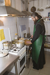 В большей степени подсолнечник мы выращиваем для того, чтобы птиц небесных кормить. И такое «солнечное» поле, как мы и сами видим, и слышим от серпуховчан и приезжих, облагораживает общий вид монастыря и города. А практическое применение находят дары огорода, расположенного рядом с этим полем. На нем братия с трудолюбивыми прихожанами выращивает картошку, капусту. На монастырском подворье, где находится часовня Иверской иконы Божией Матери (отреставрированная и освященная как церковь), иеромонах Тихон выращивает в теплице огурцы, помидоры. Ухода и заботы требуют цесарки, которые степенно расхаживают на территории монастыря. Также между службами братия занимается покосом травы. Причем косят ее, используя триммеры, газонокосилки, и в самой обители, и вокруг нее, наводя там порядок на данных нам двух гектарах земли. В продолжение разговора о послушаниях добавлю, что у нас своя просфорня: монахи пекут просфоры и на этих просфорах служат Литургию. А один из братии, иеромонах Трифон, успешно несет послушание экскурсовода. На буднях он читает и поет в храме, а между службами проводит экскурсии для паломников.
