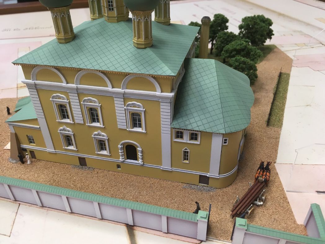 Слава Богу, люди приходят. Молодежь тоже интересуется. Экскурсия включает в себя и посещение нашего музея «Разрушенный, но живой». Он был создан при поддержке первого гранта мэра Москвы. В небольшом зале много интересных артефактов, найденных на месте бывшего монастыря и поблизости от него, что особенно ценно. Однако сейчас хочу сказать о другом. О первом шаге на пути к изготовлению макета обители с ее обилием церквей (в масштабе 1:160 и размером 1х1 метр). Это была наша давняя мечта – сделать такой проект, чтобы как-то всё визуализировать. Но проект по деньгам дорогой, поскольку работа очень кропотливая. Во-первых, сама подготовка чертежей макета включает исследование архивного материала, анализ описательных документов, сохранившихся фотоматериалов, чертежей храмов, планов территории монастыря и требует понимания законов архитектуры. Во-вторых, макет изготавливается вручную – из огромного числа мелких деталей. Их надо вырезать, склеить и вдохнуть какую-то жизнь, разместив, например, недалеко от собора людей и лошадок, везущих на телеге дрова. И вот в начале этого года макет пока лишь соборного пятиглавого храма во имя святого Иоанна Златоуста мы смогли показать участникам VII научно-практической конференции «Златоустовские чтения». Дальше, Бог даст, Благовещенскую церковь поставим. И так шаг за шагом… Макет собора выполнен в мастерской Вадима Пчелкина, ранее изготовившего макет Страстного монастыря.