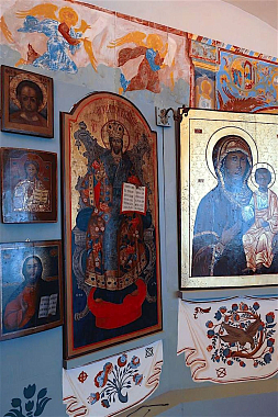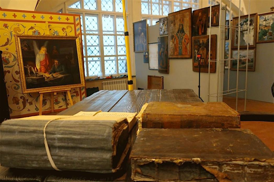 Музейная экспозиция размещена высоко под куполом храма, до нее три крутых лестничных пролета. Пока вы поднимаетесь в музей, вы уже погружаетесь в его атмосферу. Вдоль стен по лестнице расположены картины, которые в дар музею преподнесли художники из разных городов нашей страны, а также Украины и Белоруссии. Это живописцы, с которыми наш монастырь много лет сотрудничает в рамках Международного пленэрно-выставочного проекта «Русская Атлантида», организованного Санкт-Петербургским центром гуманитарных программ под руководством заслуженного работника культуры Российской Федерации В.В. Васильева.