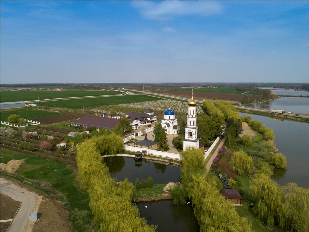 Наше подворье в Динском районе стало местом притяжения, когда 9 июля 2007 года, в праздник Тихвинской иконы Божией Матери, неожиданно забил источник. А до этого мы в течение двух лет с молитвой приводили в порядок полученную запущенную землю обанкротившейся колхозной садовой бригады, и никому это место интересно не было. Из колхозной кузницы сделали первый храм в честь преподобного Саввы Освященного, стали молиться. Господь и Пресвятая Богородица услышали молитвы, и при попытке соединить два искусственно вырытых пруда, на перешейке между ними тремя фонтанами забил источник. Гидрологи выяснили, что источник бьет из далекого подземного святого озера, из которого берут начало многие источники России.