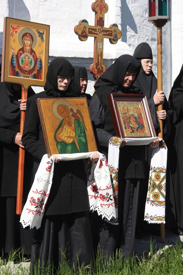 Настоятельница обители игумения Раиса (Шибеко) с небольшой тогда сестринской общинкой приступила к возрождению разрушенной обители весной 1999 года, о чем она подробно рассказала нашему сайту в интервью «Место тяжелое, но спасительное». Основной монастырский храм – Матери Божией «Знамение» – стоял в руинах, Божественная литургия совершалась в малом приделе Иоанна Богослова. Появление в монастыре трех икон – больших образов «Господь Вседержитель», «Знамение» Божией Матери и чудотворного – апостола и евангелиста Иоанна Богослова – восприняли здесь как чудо Божие. А было так: ровно 15 лет назад, 9 октября в малом приделе Иоанна Богослова совершалась праздничное богослужение, а на солее в разрушенном Знаменском храме накануне установили тумбочку, где после Литургии собирались служить молебен Спасителю. Именно в этот день незнакомый для многих человек пожертвовал обители красивейший образ «Господь Вседержитель», который Матушка-настоятельница с ныне почившим уже архимандритом Кириллом, настоятелем Спасо-Преображенского мужского Муромского монастыря и благочинным женских монастырей Владимирской епархии, отнесли в Знаменский храм и поставили на пустующую тумбочку, словно специально ожидавшую его. Сестры тут же зажгли свечи, а ковер они еще раньше положили. Начался молебен, многие заплакали...