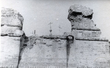 Начали разрушать монастырские стены. Сначала принялись за западную часть со стороны пруда. Одна бригада рабочих ломами отбивала у стен целые кирпичные блоки, а другая лебедкой, установленной у самой воды, стаскивала эти блоки вниз. До войны успели уничтожить стену между северо-западной и средней башнями и верх стены от средней до юго-западной башни. В начале войны были уничтожены все навершия. В подклете собора, в усыпальнице, было оборудовано бомбоубежище. Когда немцы подходили к Москве, жителям было предписано покинуть монастырь, так как собирались в нем сделать опорный оборонительный пункт, но дело кончилось только тем, что был вырыт ДОТ возле стены со стороны площади.