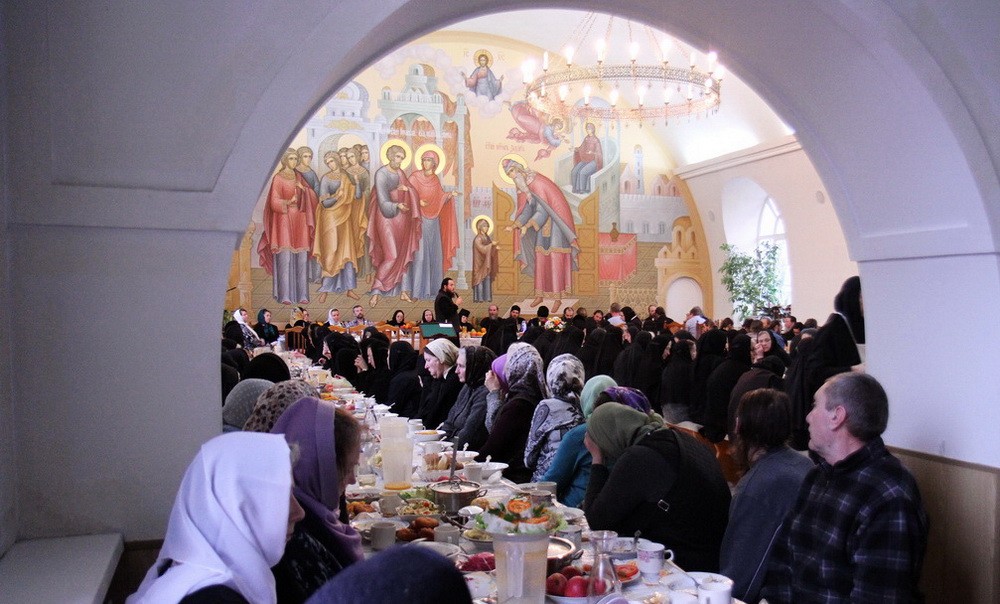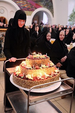 Далее читаем в ответе из монастыря: «К престольному празднику в обители готовятся все 170 сестер задолго: в храме, на территории городской части монастыря, на подворьях проводится генеральная уборка. Сестры, несущие послушание в социальном отделе, рассказывают о предстоящем празднике своим подопечным: инвалидам-опорникам, осужденным, малоимущим, детям в детских домах и социально-реабилитационных центрах, в Центре подготовки приемных родителей и сопровождения замещающих семей. Сестры издательского отдела готовят материалы для монастырского сайта, снимают небольшие фото- и видеозарисовки о жизни монастыря. Кухонные сестры обдумывают меню праздничной трапезы. Поскольку престольный праздник приходится на Рождественский пост, то пища в этот день постная. Вообще-то готовить вкусную постную пищу умеют, практически, во всех монастырях. А мы на основании нашего опыта как-то издали книгу "Во дни поста" с рецептами блюд на каждый пост – обычный или строгий. Когда миряне попадают к нам на праздничную трапезу, то удивляются: "Торт? Разве может быть торт постным?" – "А это что? Точно не мясо?" Объясняем им, что наше "мясо" – рыба и грибы. В этом году собираемся подать на стол сельдь под шубой, бутерброды с икрой, соленую рыбу, салат с кальмарами, салат овощной с фасолью, грибной суп, пельмени, картофельное пюре, рыбные колеты или запеченную рыбу в фольге, морс из облепихи, рулеты с маком, фрукты. Меню разнообразное: хочется всех гостей накормить по-праздничному!