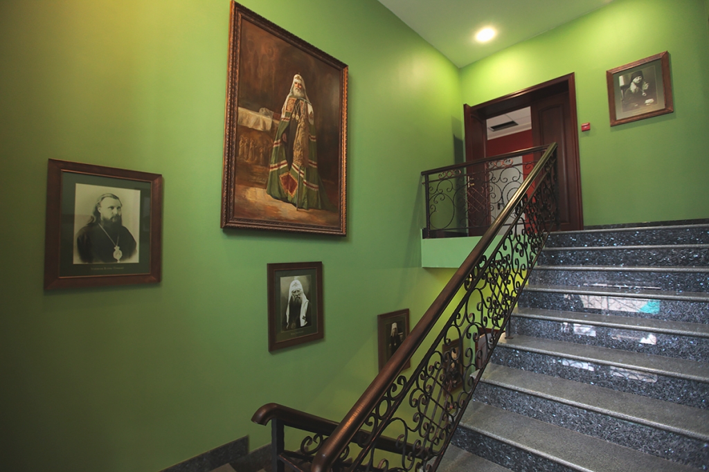 На парадных лестницах большие портреты насельников Сретенского монастыря: патриарх Сергий (Страгородский), митрополит Серафим (Чичагов), архиепископ Иларион (Троицкий), архиепископ Фаддей (Успенский), архиепископ Лука (Войно-Ясенецкий), епископ Вениамин (Милов), епископ Афанасий (Сахаров), епископ Феодор (Поздеевский), архимандрит Серафим (Тяпочкин), архимандрит Иоанн (Крестьянкин), протоиерей Алексей Воробьев, профессор Алексей Федорович Лосев и многие другие.
