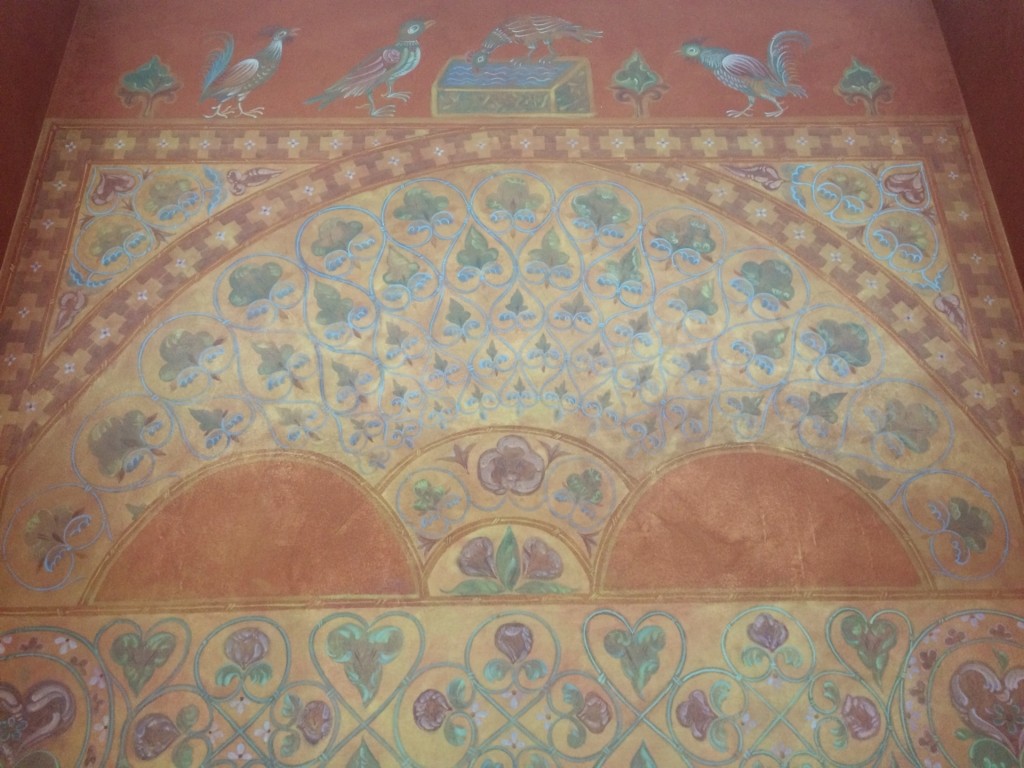 Одна из стен третьего этажа расписана уже знакомыми византийскими орнаментами. Другая — украшена гравюрами с видами русских городов и Сретенского монастыря.