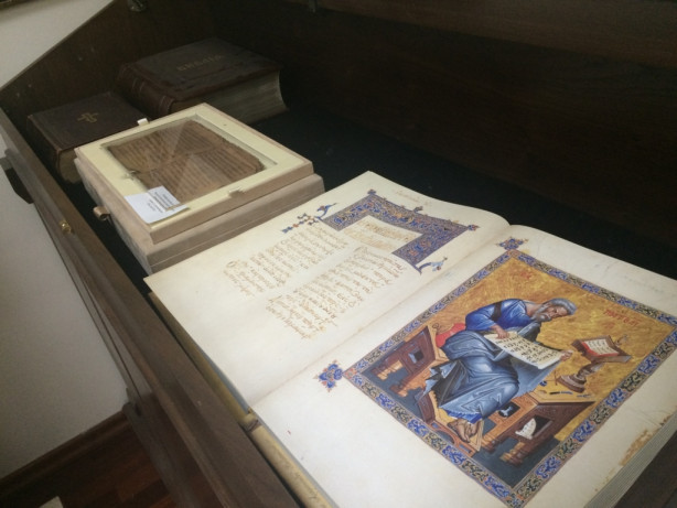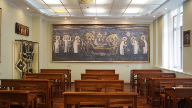 Копии балканских фресок встречают заходящих в аудиторию. Это не просто иконы, а шедевры иконографии, каждая деталь которых исполнена глубочайшего литургического и богословского смысла. Здесь же, в подлинниках, — дониконовский антиминс и епископское богослужебное облачение, принадлежавшее митрополиту Вениамину (Федченкову), писателю и подвижнику. Владыка известен своими литургическими трудами и трогательными, полными простоты и веры рассказами из его «Записок архиерея».