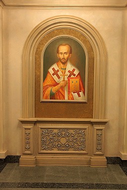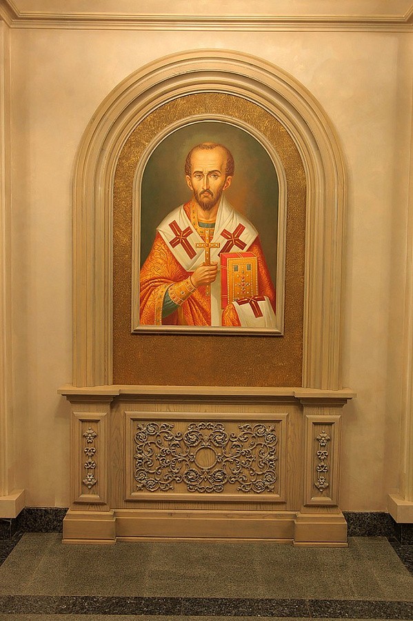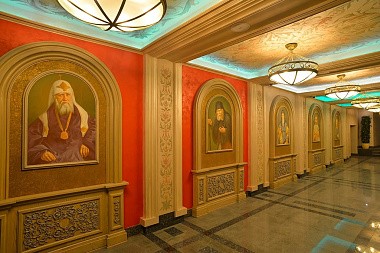 Вернемся на первый этаж и продолжим путешествие. Нас встречают великие учителя и подвижники Церкви — апостол Петр, святитель Иоанн Златоуст, преподобный Серафим Саровский и святитель Тихон, Патриарх Российский. Парсуны с их изображениями находятся в парадном фойе семинарии. К слову, мощи первого после синодального периода патриарха обретались при участии нашего ректора, епископа Тихона (Шевкунова). И наречен ректор именем Тихон как раз в честь святителя.