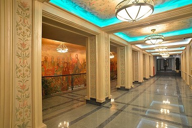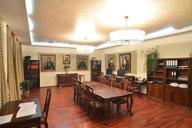 Пройдя по первому этажу, спустимся вниз, чтобы на минуту заглянуть в актовый зал семинарии. Различные собрания, встречи студентов с интересными людьми, презентации книг Издательства Сретенского монастыря — все это здесь.