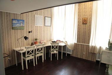 Аудиторию украшает русская иконография Ангелов кисти преподобного Андрея Рублева. А в углу аудитории — облицованная изразцами печь (стилизованная, конечно, но очень уютная).