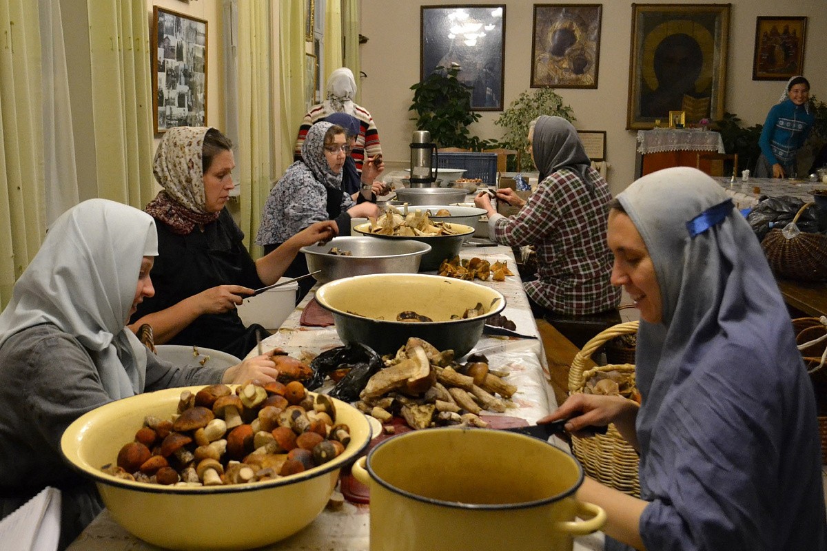 Все труды в обители несут сами сестры, кроме профессионально-сложной или тяжелой мужской работы (на что имеется небольшая ремонтно-строительная бригада). Из послушаний на первом месте – воспитанницы, а хозяйство на втором. В монастыре есть послушания, связанные с общением со светскими людьми: благочинная, бухгалтер, эконом, а также те, кто преподают на Богословских курсах и в деревенской школе, катехизаторы. Воспитательницы, учительницы – с самого утра заняты с детьми. На кухне, на коровнике работа тоже начинается с раннего утра. Послушания чередуются. Сестры, которые сегодня трудятся на коровнике, завтра могут регентовать в храме, а потом пойти на помощь к сестрам-воспитателям, послезавтра – оказаться на кухне или в иконописной. В обители принципиально не прививается отношение к тяжелой работе, как к наказанию. Коровник – это не епитимья, а рядовое послушание. В монастыре нет черной работы, любой труд – во славу Божию, перед Лицом Божиим.