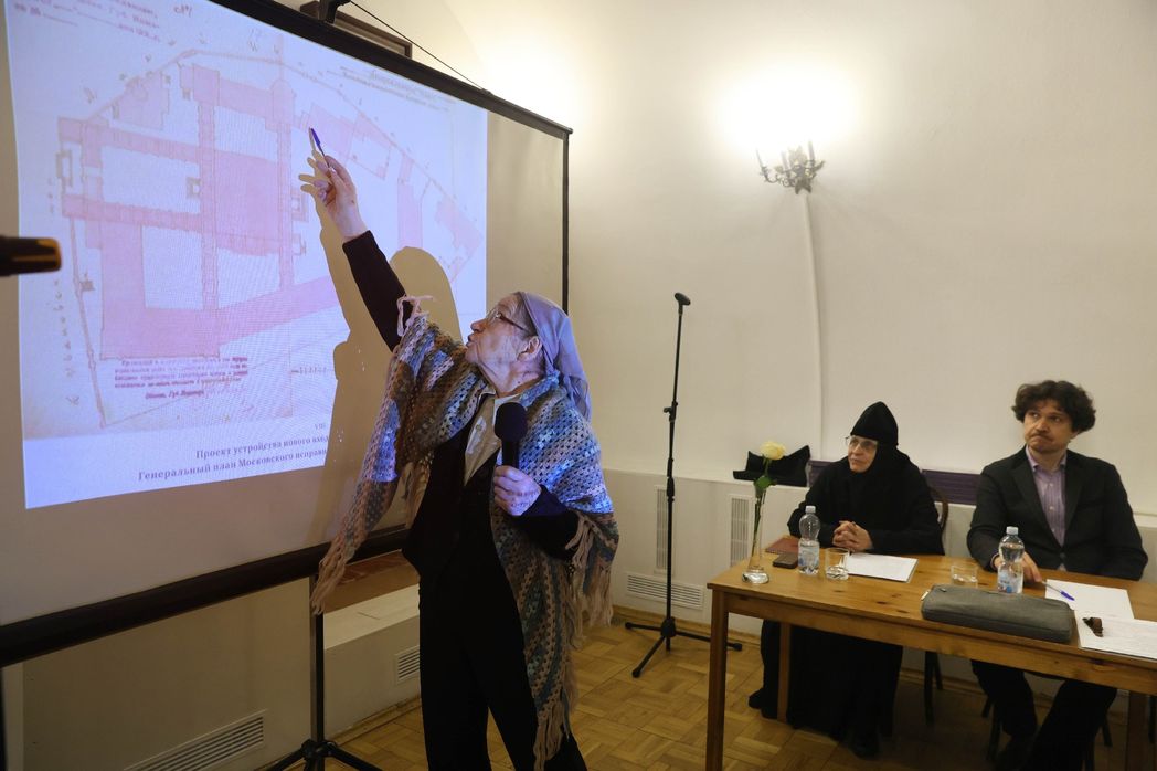 Д.Г. Давиденко, кандидат исторических наук, историк-архивист обители поделился найденной информацией о том, как монастырь существовал в военные предреволюционные годы, как происходили его закрытие, передача в ведение отдела принудительных работ НКВД, изъятие церковных ценностей. Есть подтверждение, что с 1919 (или даже 1918) года в стенах монастыря был устроен Ивановский концентрационный лагерь особого назначения, который к 1924 году был обращен в Московский Исправтруддом с «переходным исправительно-трудовым отделением». Все это время, в течение примерно десяти лет в монастыре продолжала жить община сестер. Сначала их было более двухсот, затем число уменьшалось, но еще в 1926 году насельниц было больше ста. Пытаясь уйти из-под удара, сестры вкладывали новым хозяевам жизни мысль о «коммунистическом характере» монастырского труда, в частности, в швейной мастерской, где они работали. Это было странное сосуществование невест Христовых бок о бок с неблагонадежным «исправляющимся» контингентом, представители которого, бывало, обворовывали сестер, похищая остатки церковной утвари, уцелевшие после экспроприации… Пока не найдено точных свидетельств, как совершались богослужения, но известно, что насельницам были оставлены часовня и домовый храм; возможно, иногда службы проходили и в соборе. До сих пор непонятно даже, как была разделена территория монастыря. Этот вопрос вызвал оживленное обсуждение, в которое включилась почетный реставратор Москвы Лидия Алексеевна Шитова, много потрудившаяся для второго возрождения обители. Из ее комментария и замечаний Дмитрия Григорьевича было понятно, что третий том документов еще далеко не закрывает все «белые пятна» даже в такой, казалось бы, близкой к нам истории.