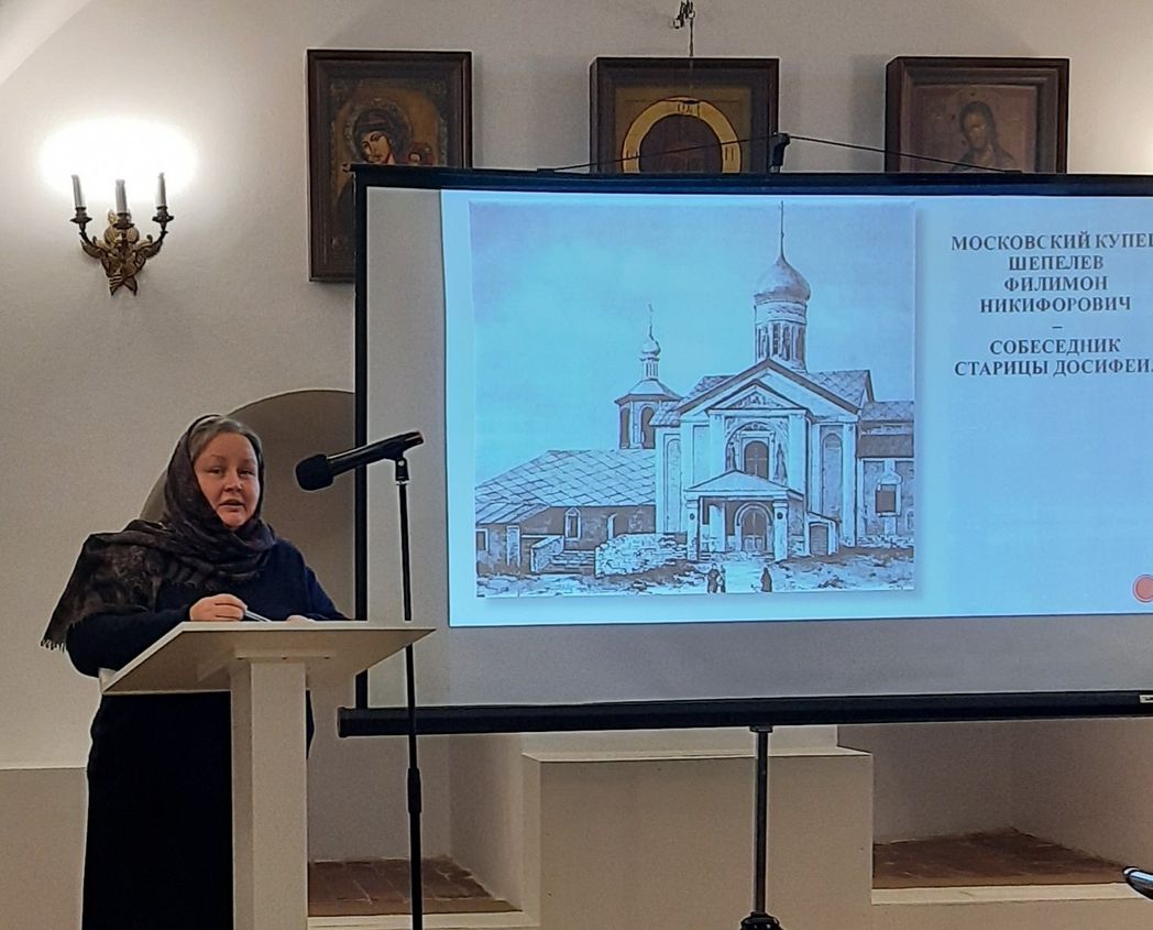 Экскурсовод Иоанно-Предтеческого монастыря, советник управы Дмитровского района Москвы С.В. Духанова сделала очень интересное сообщение о московском купце Филимоне Никифоровиче Шепелеве (ок. 1763–1858), торговце чаем и сахаром, который не только по милости Божией был одним из редчайших собеседников старицы во время ее пребывания в Ивановском монастыре, но и являл собой некий образец старинного благочестия, будучи попечителем нескольких монастырей, в том числе Оптиной пустыни, находясь в близком духовном общении с подвижниками и старцами этих обителей.