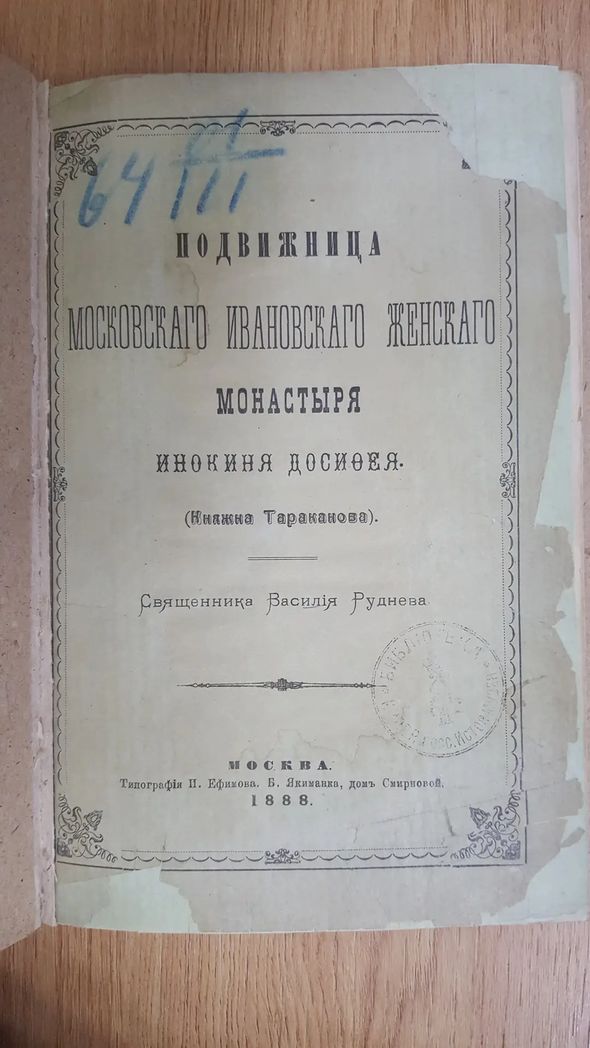 3. Василий Руднев, свящ. (с 1901 г. – архим. Тихон). Подвижница Московского Ивановского женского монастыря инокиня Досифея (княжна Тараканова). М.: Тип. И. Ефимова, 1888. С. 13.
