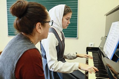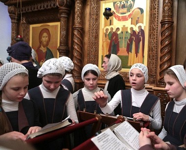 «В монастыре девочки проживают, здесь же они учатся. Учатся они бесплатно, на полном обеспечении монастыря. Питание обеспечиваем, форму шьем, и учебную, и концертную тоже, – рассказывает мать Паисия. – Практика хорового дирижирования проходит в храме. Есть череда, воспитанницы ходят на службы по очереди, а в воскресные, праздничные дни поют вместе с сестрами на два хора».