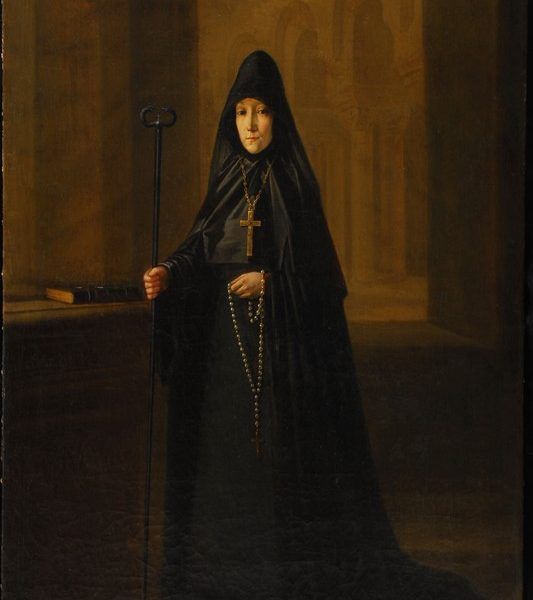 С картины на нас смотрит молодая красивая женщина, чьи тонкие черты лица говорят о благородном происхождении, а строгое, волевое лицо – о твердости характера. Одна рука сжимает игуменский посох, другая – четки, символ непрерывающейся молитвы. Сдержанные, почти монохромные краски полотна подчеркивают аскетизм монашеского облика. Но особый внутренний свет наполняет картину обаянием человеческого тепла, скрытого под темными одеждами.
