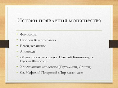 Сегодня мы поговорим о том, как появился феномен, называемый монашеством. Корнями он восходит к Египту периода I–IV веков. Там он фактически сформировался, и оттуда это дерево пустило свои ветви в другие страны. Говоря о возникновении монашества, мы должны будем затронуть некоторые сродные слова: «отшельничество», или – в целом – «аскеза». Монашество – это вид аскезы, которая появилась в форме отшельничества.