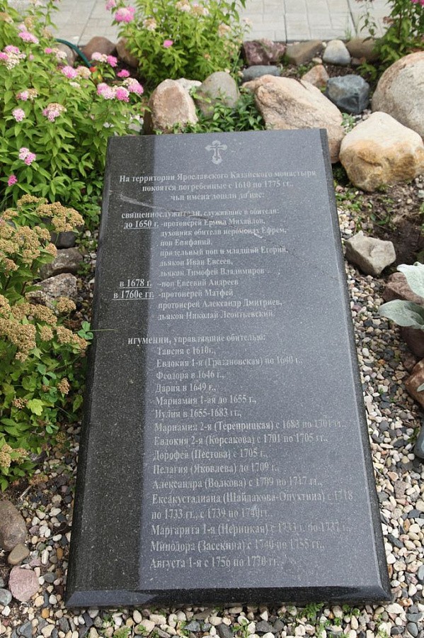 На территории монастыря установлен гранитный крест в память обо всех пострадавших в кровавом подавлении белогвардейского восстания 1918 года. Тогда в течение нескольких дней город был под обстрелом дальнобойных орудий, непрерывные залпы которых прекратились 21 июля, в день Казанской иконы. Здесь, после упразднения обители, в 20-е годы находился концлагерь, отбывали наказание поддержавшие «мятеж», шли допросы, расстрелы. У креста ежегодно служится панихида. Особенно в монастыре почитается память новомучеников и исповедников Российских. В день памяти святителя Агафангела, возглавляющего собор Ростово-Ярославских новомучеников, в обители служат архиереи, собирается духовенство епархии. В такие дни много причастников, много молящихся.