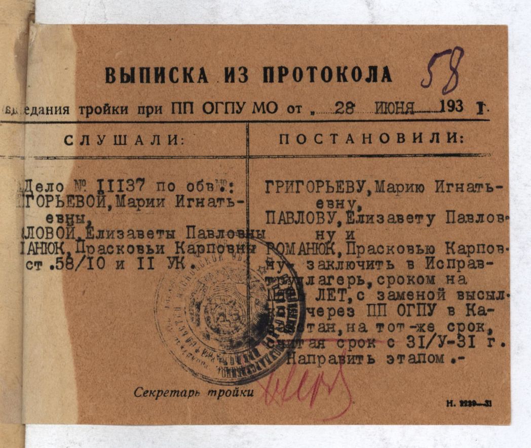 Десять сестер Ивановской обители и отец Владимир Смирнов были приговорены к ссылке в Северный край, остальные шесть сестер были высланы в Казахстан.