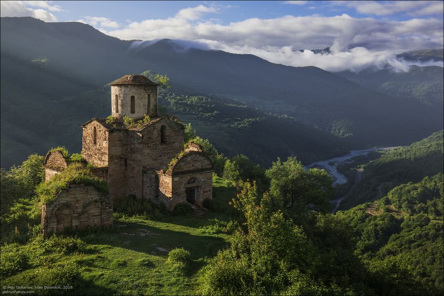 На возвышенности Бурун, расположенной неподалеку от известного горнолыжного курорта Домбай, находится древний Сентинский храм. Путь к нему не так прост, как кажется на первый взгляд. Нужно подняться от дороги сначала по грунтовой, а затем по горной тропе к небольшому плато. Но труды паломника вознаграждаются сторицей. И не только открывшейся панорамой Кавказского хребта, а прежде всего строгой красотой лаконичной архитектуры древнего храма с небольшой усыпальницей.