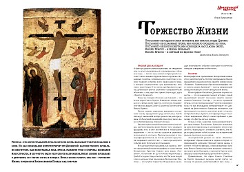 Голгофа – это место страданий, печали, которое всегда вызывает чувство покаяния и боли. Но как неожиданно интерпретирует это Дионисий: на фоне тонкого, буквально изогнутого, как виноградная лоза, креста, раскинув руки в стороны, изображен Иисус Христос. В его фигуре будто отсутствует напряжение, Иисус словно пребывает в движении, его фигура легка и изящна. Икона залита светом, она вся – торжество Жизни, предвестие Воскресения и Победы над смертью