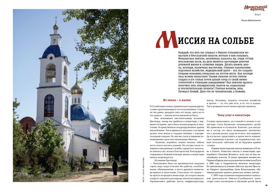 Каждый, кто хоть раз слышал о Николо-Сольбинском монастыре в Ярославской области, мечтает в нем побывать. Монашеская обитель, затерянная, казалось бы, среди густых ярославских лесов, на деле является настоящим центром духовной жизни и служения людям. Десять храмов, школа, колледж, различные мастерские, учебные лаборатории, подсобное хозяйство, медицинский центр – все это создано трудами монахинь буквально на пустом месте. Как посреди леса возник монастырь? Каким образом сестры сумели создать в его стенах почти целый город со своей инфраструктурой и учебными заведениями? Как обители удалось получить пять президентских грантов на социальные и просветительские проекты? Горячая молитва, вера, Промысл Божий. Дело рук не человеческих, а Божиих. Репортаж Ольги Шевкаленко.